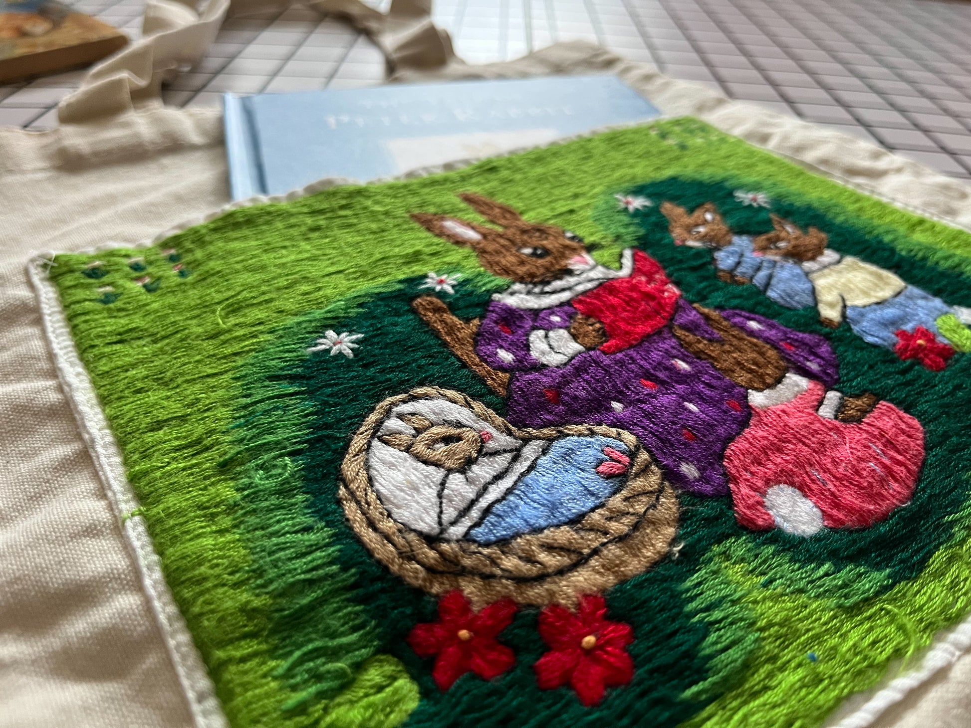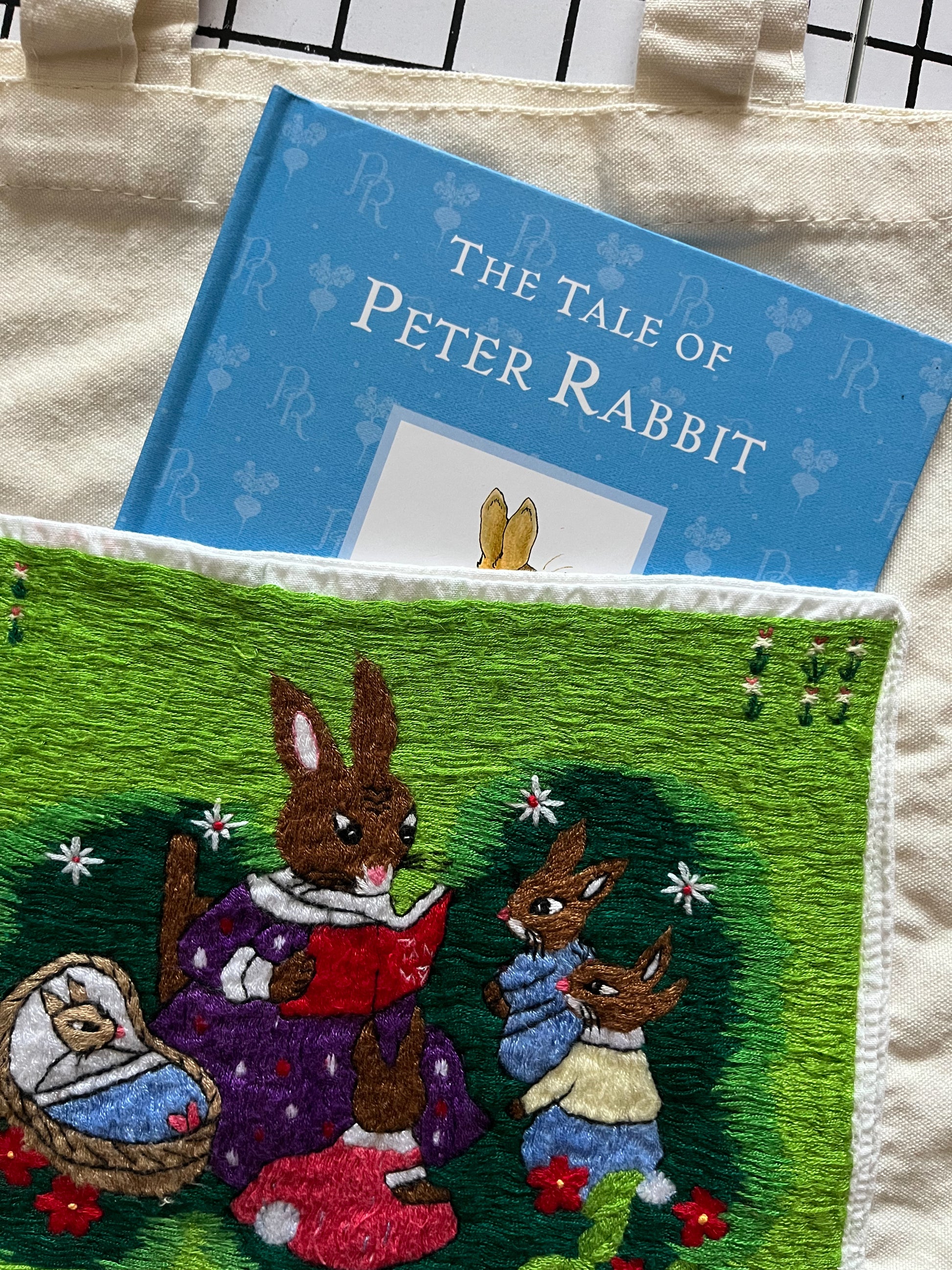This Peter Rabbit storybook gift set includes a previously loved loved copy of The Tale Of Peter Rabbit (please note at checkout if you would prefer the book or hardcover version) and a tote bag with a stunning vintage embroidery scene from the Peter Rabbit Universe as a large front pocket.