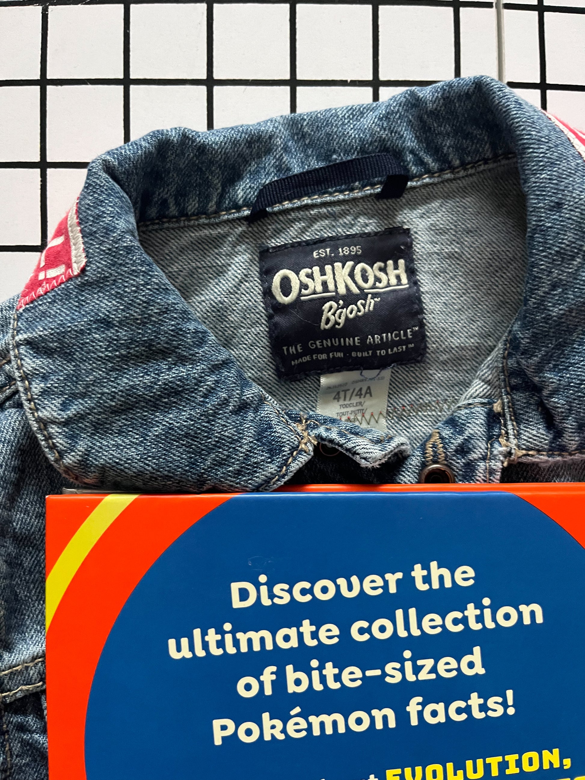 This Pokemon storybook gift set includes a previously loved copy of Pokemon Big Book of Facts, an upcycled Pokemon gotta catch em all denim jacket, and an Evee plushie.