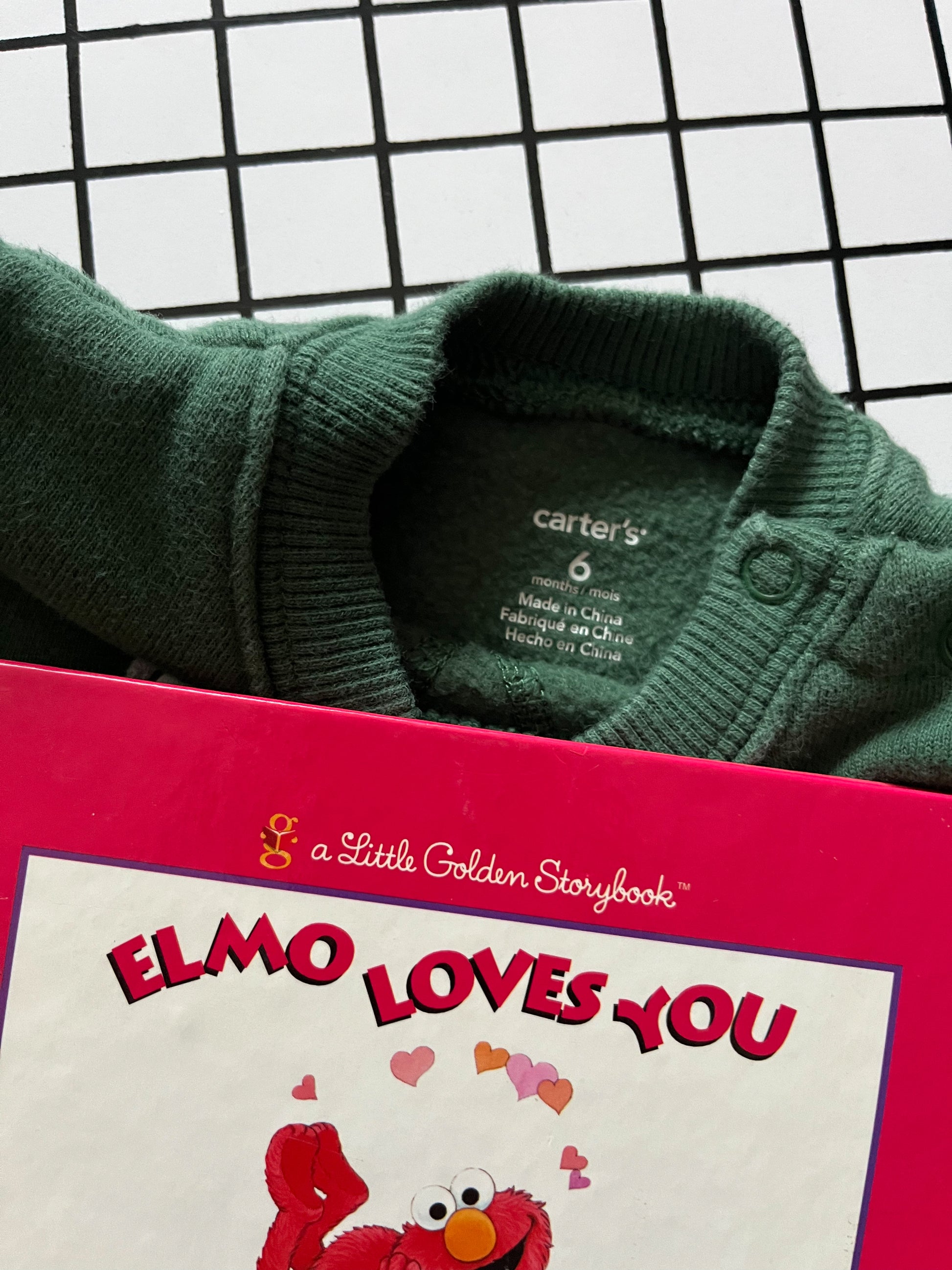 This Elmo storybook gift set includes a previously loved little golden book copy of Elmo Loves You, and a green romper with an Elmo appliqué on the front.