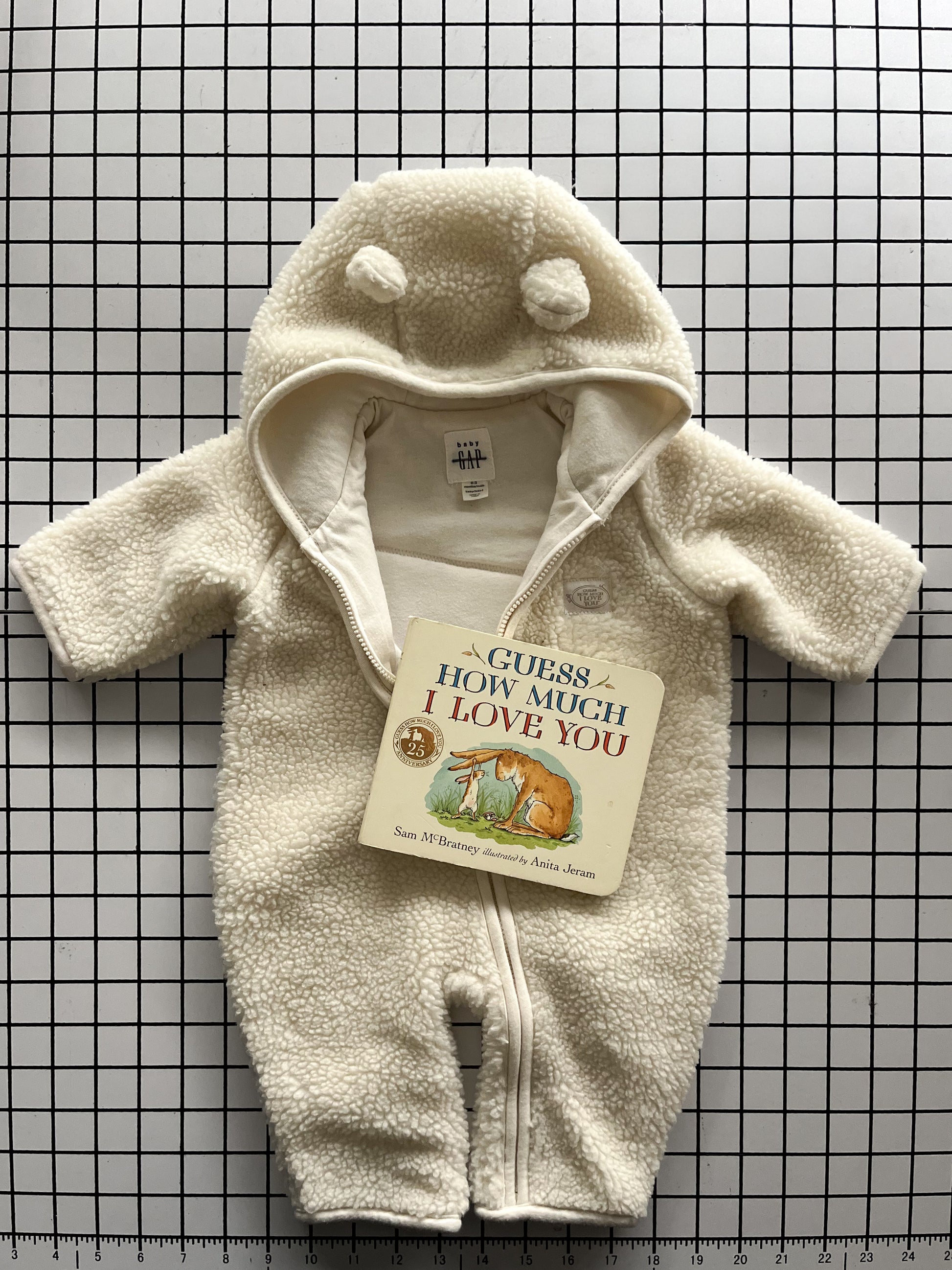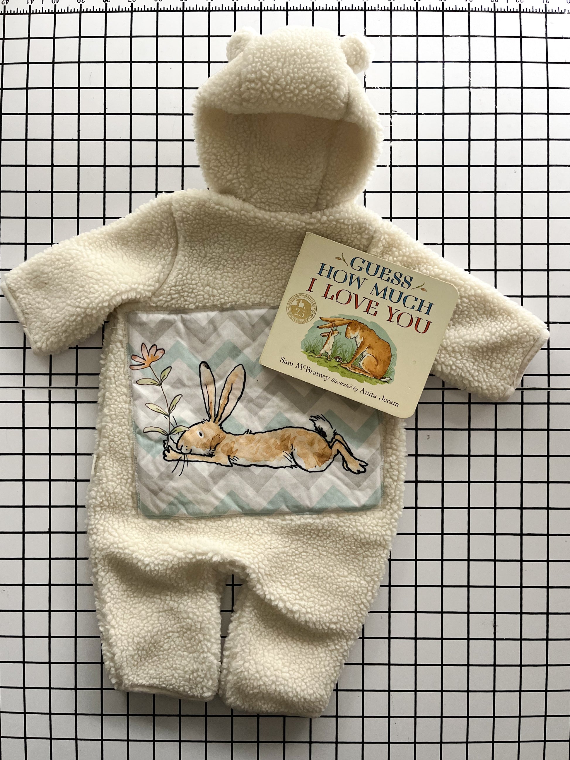 This GHMILY storybook gift set includes a previously loved board book copy of Guess How Much I Love You and an upcycled cozy fleece bunting suit in size 0-3mos.