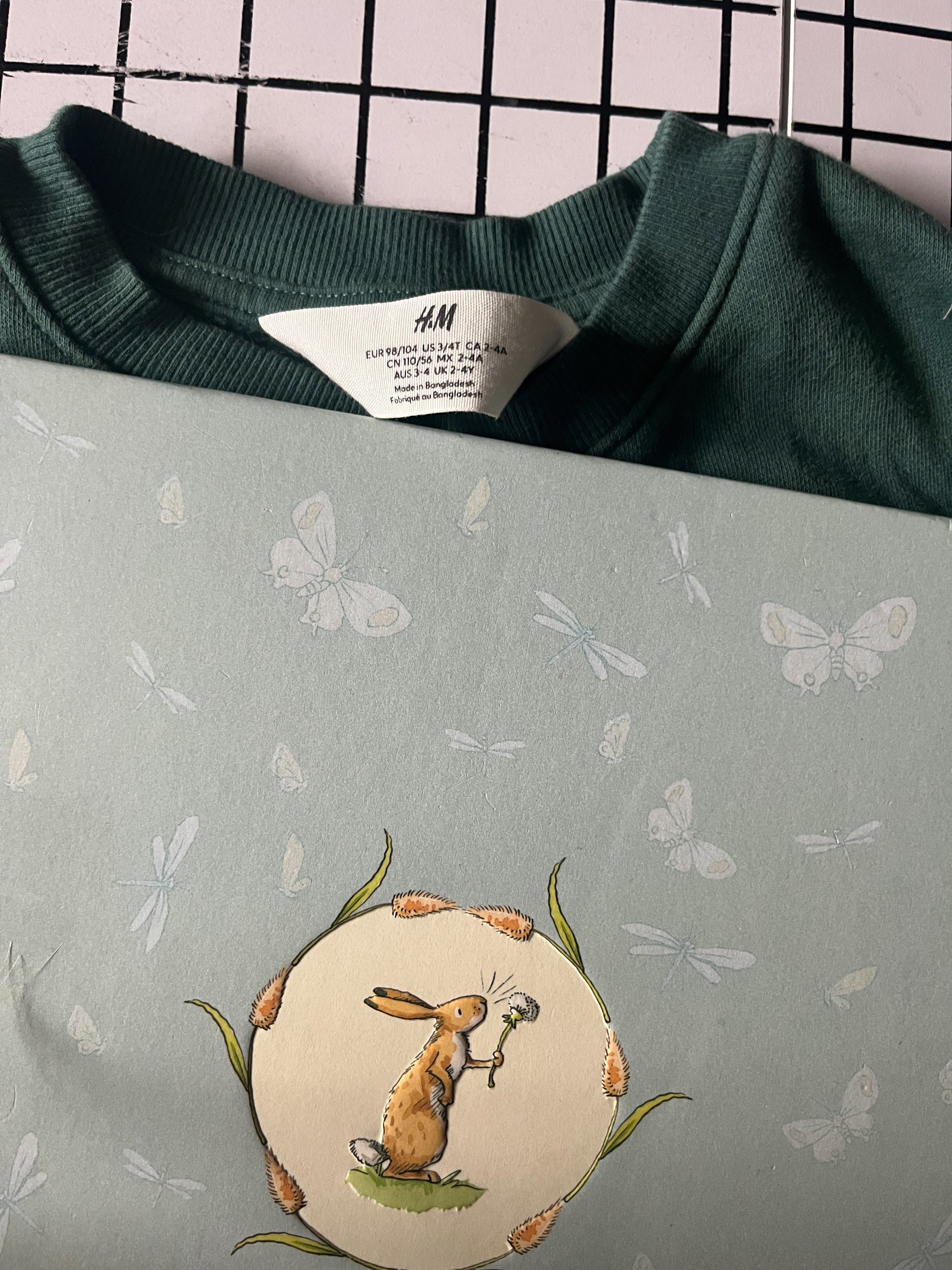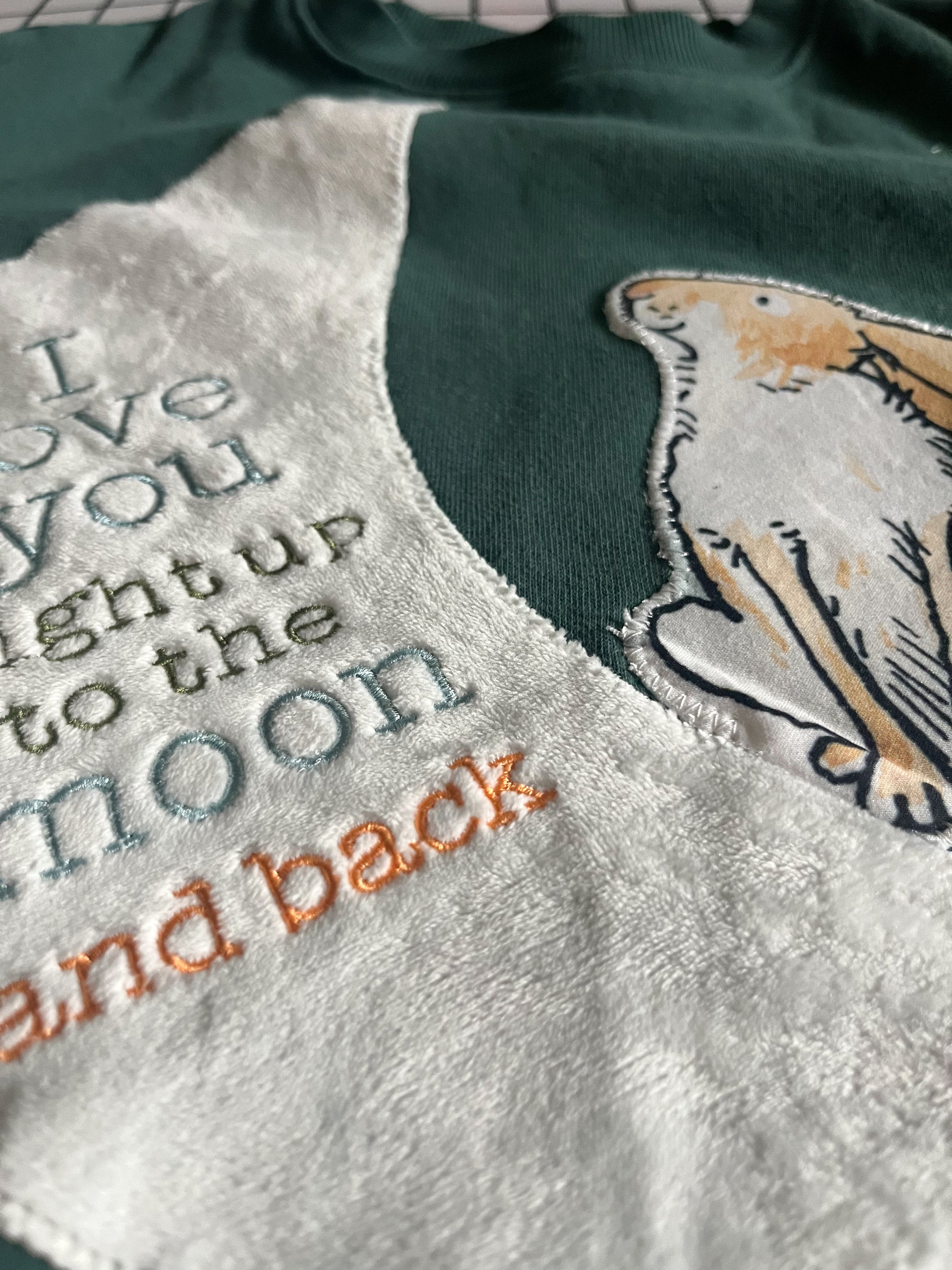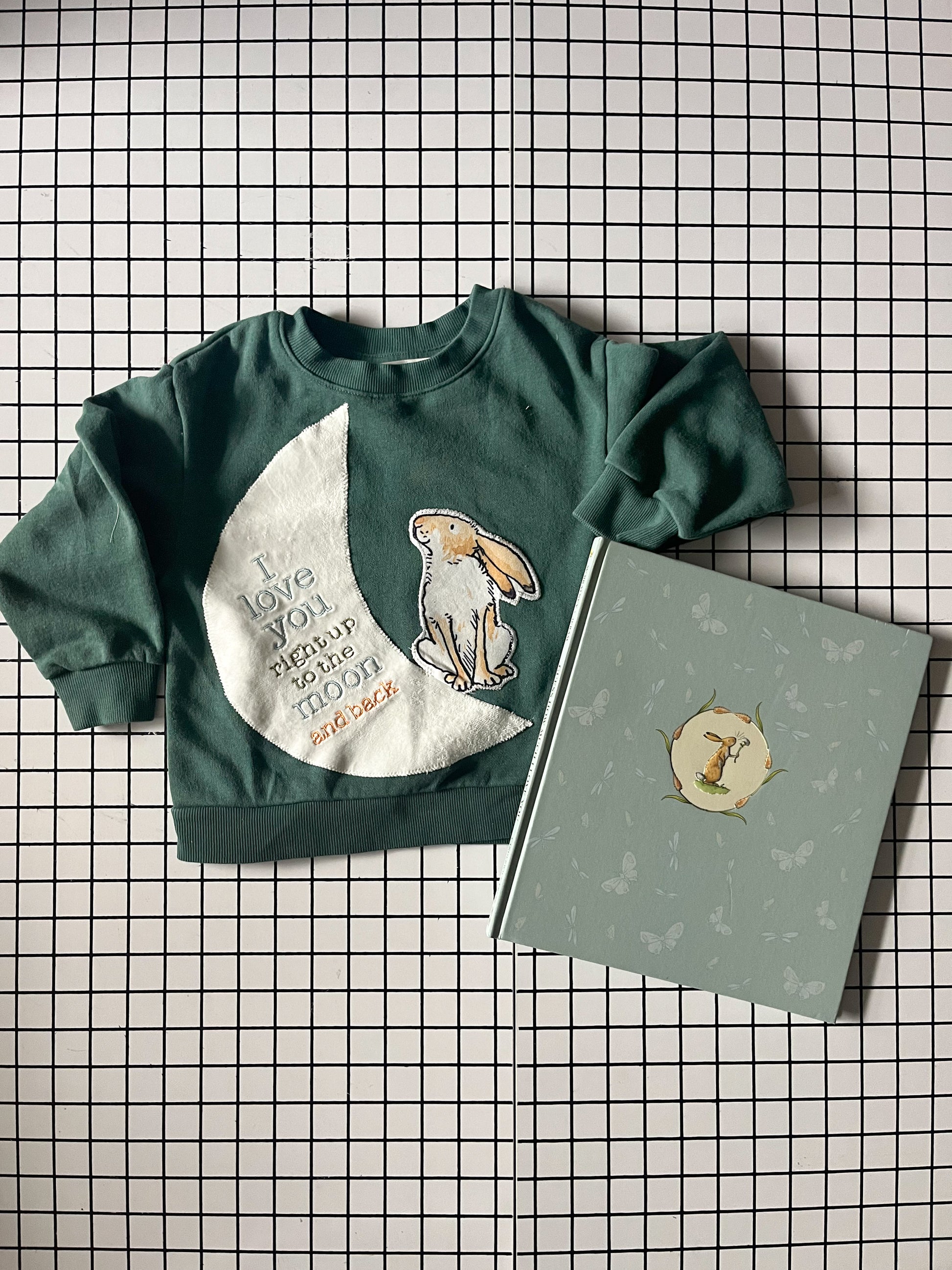 This GHMILY storybook gift set includes a previously loved hardcover copy of Guess how Much I Love You and an upcycled teal GHMILY sweater in size 3/4. Let me know in the order notes if you prefer the classic board book copy instead.