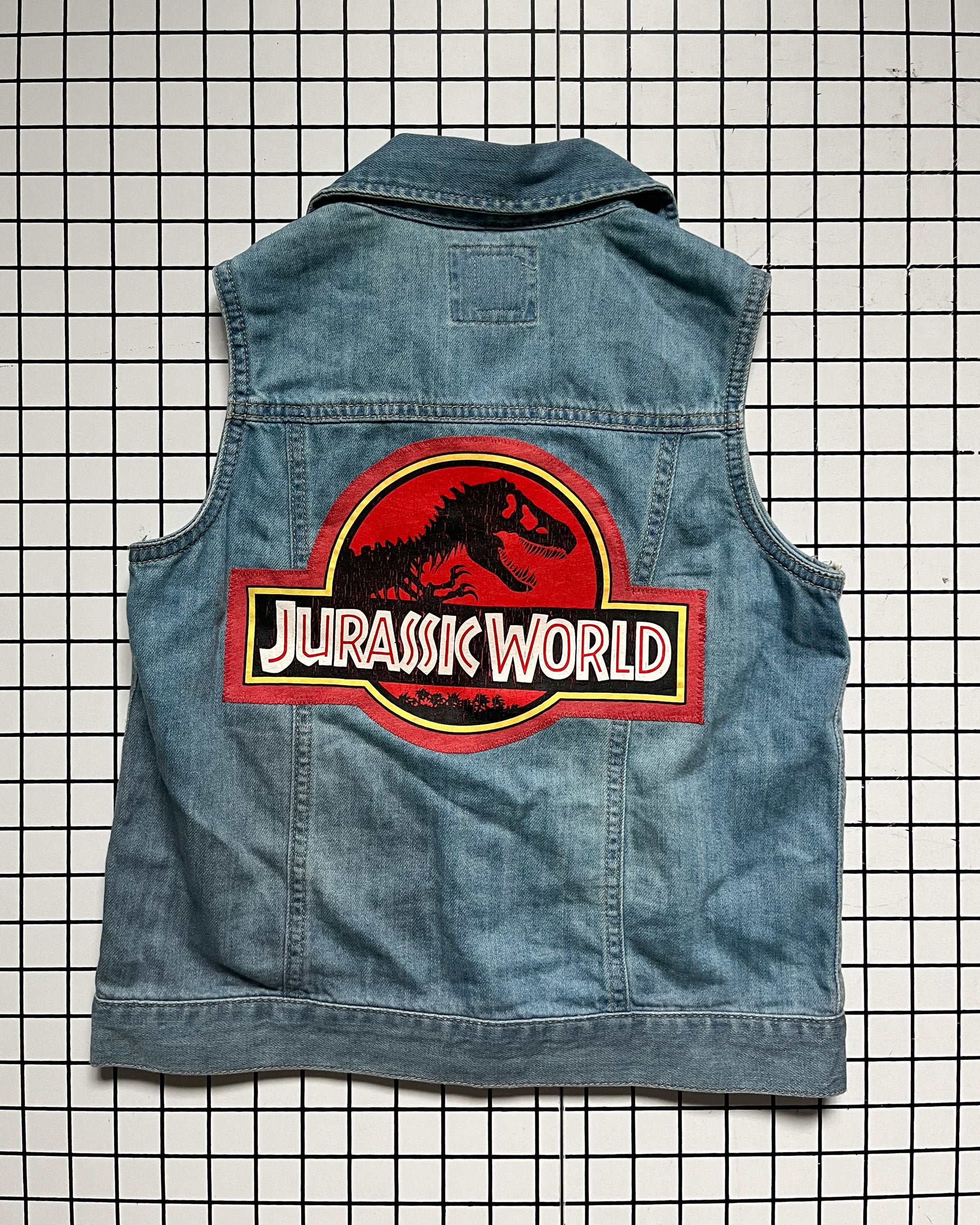 This Jurassic World Be Kind Rewind Vest is upcycled with a backhit patch made from a secondhand Jurassic World t-shirt and is truly one of a kind. This vest is ready to ship.