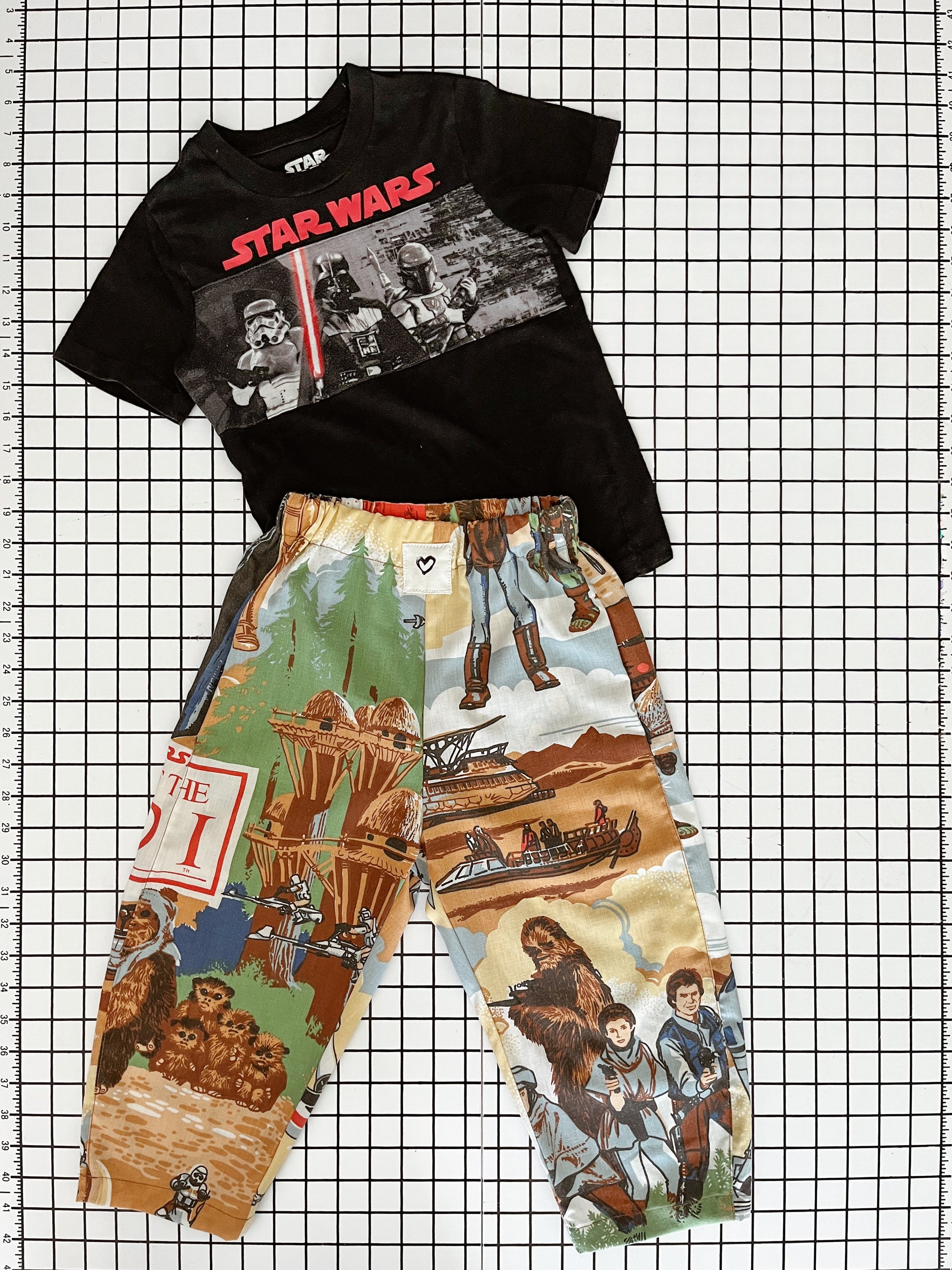 Upcycled from vintage star wars bedsheets, these pants feature a roomy barrel leg, an elastic waistband with a drawstring, and a rear pocket to hold your treasures.