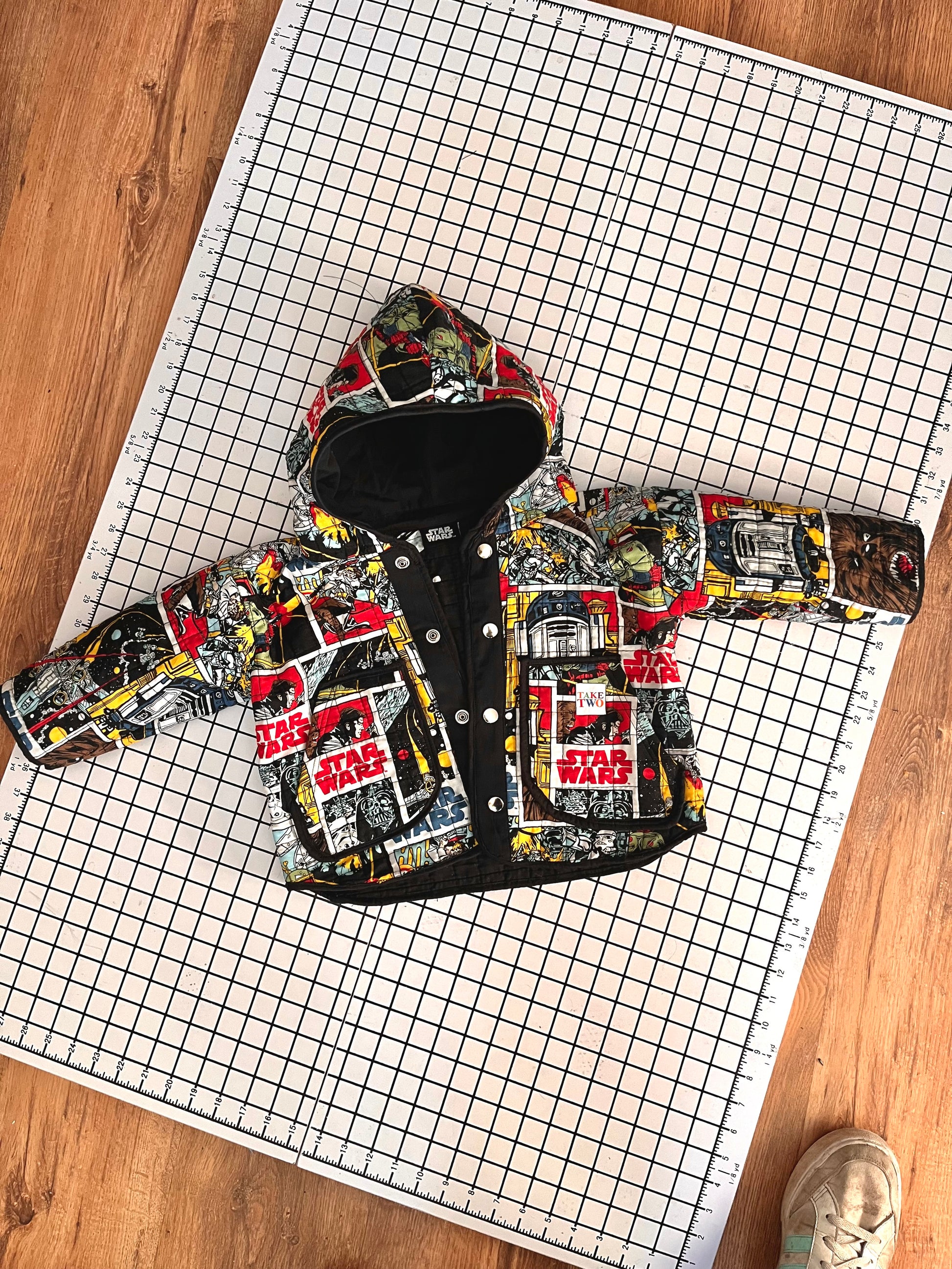 This Star Wars storybook gift set includes a previously loved copy of the the Star Wars ABC board book and a Star Wars jacket upcycled from a quilt in size 2T.
