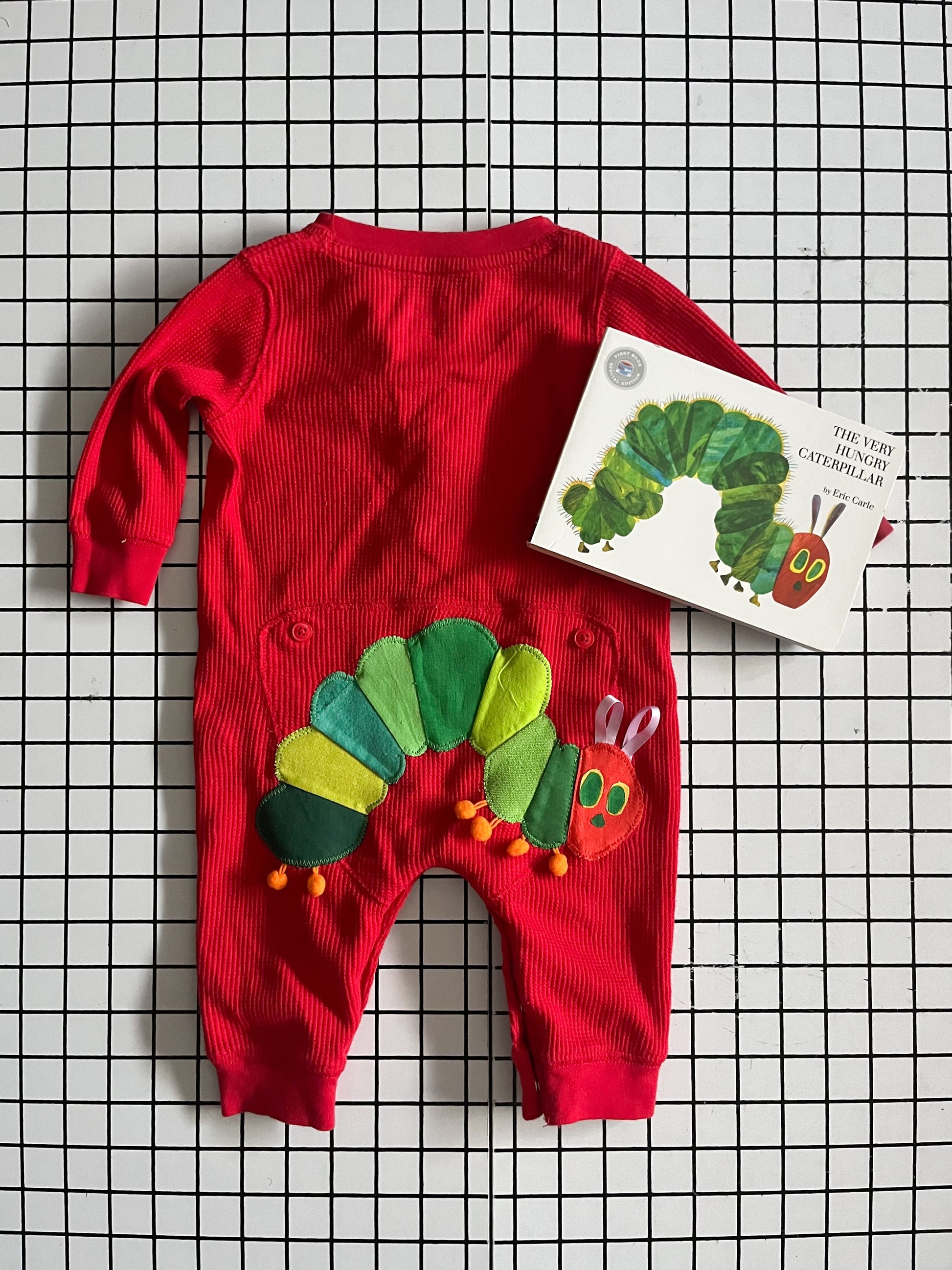 This Hungry Caterpillar storybook gift set includes a previously loved Board book copy of the classic children’s book, and a romper with a handmade caterpillar appliqué on the bum.